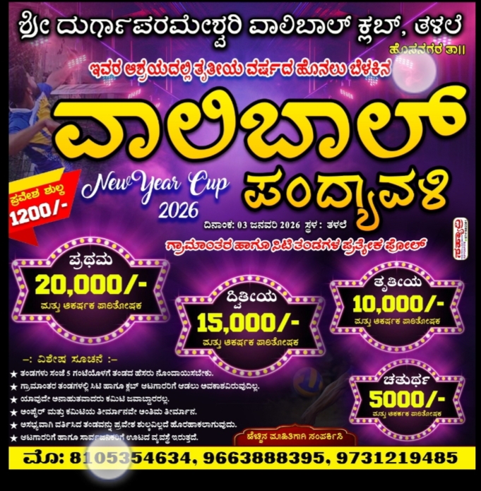 ಶ್ರೀ ದುರ್ಗಾಪರಮೇಶ್ವರಿ ವಾಲಿಬಾಲ್ ಕ್ಲಬ್ ತಳಲೆ , ಹೊಸನಗರ ತಾಲೂಕು. ಇವರ ಆಶ್ರಯದಲ್ಲಿ ತೃತೀಯ ವರ್ಷದ ಹೊನಲು ಬೆಳಕಿನ ವಾಲಿಬಾಲ್ ವಾಲಿಬಾಲ್ ಪಂದ್ಯಾವಳಿಯನ್ನು 3 ಜನವರಿ 2026 ತಳಲೆ ಗ್ರಾಮದಲ್ಲಿ ನಡೆಸಲಾಗುತ್ತಿದೆ. ವಾಲಿಬಾಲ್ ಪಂದ್ಯಾವಳಿಯ ಕಾರ್ಯಕಾರಿ ಸಮಿತಿಯ ಅಧ್ಯಕ್ಷರಾದ ಶ್ರೀ ಶ್ರೇಯಸ್…